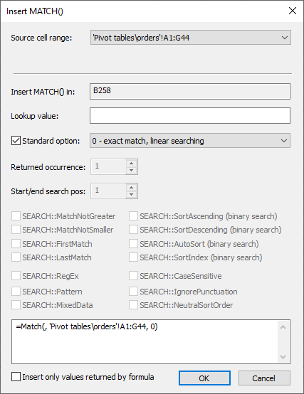 You can insert the match() function with just two clicks using the Insert > MATCH() command. The displayed "Insert MATCH()" dialog box determines the optimum parameters, pre-set all the options and automatically creates the formula.