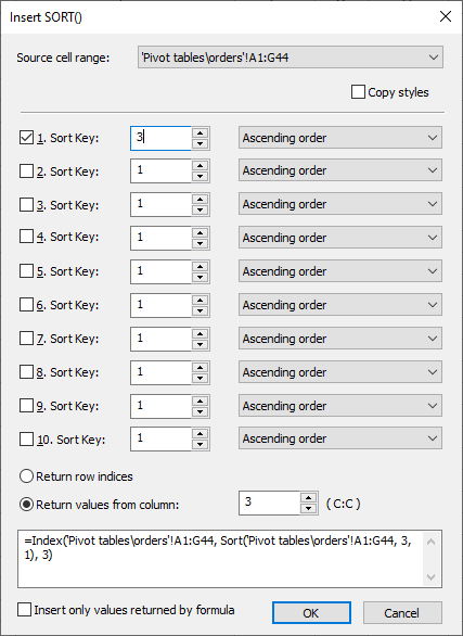You can insert the Sort() function with just two clicks using the Insert > SORT() command. The displayed "Insert SORT()" dialog box determines the optimum parameters including the option to copy styles from the selected source data range and automatically creates the formula.