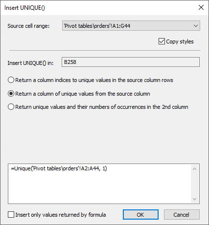 You can insert the Unique() function with just two clicks using the Insert > UNIQUE() command. The displayed "Insert UNIQUE()" dialog box determines the optimum parameters including the option to copy styles from the selected source data range and automatically creates the formula.